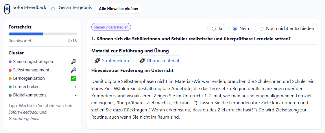 Zur Entwicklung dieser Kompetenzen steht Lehrkräften eine interaktive Checkliste zur Verfügung, die Lehrkräfte dabei unterstützt,